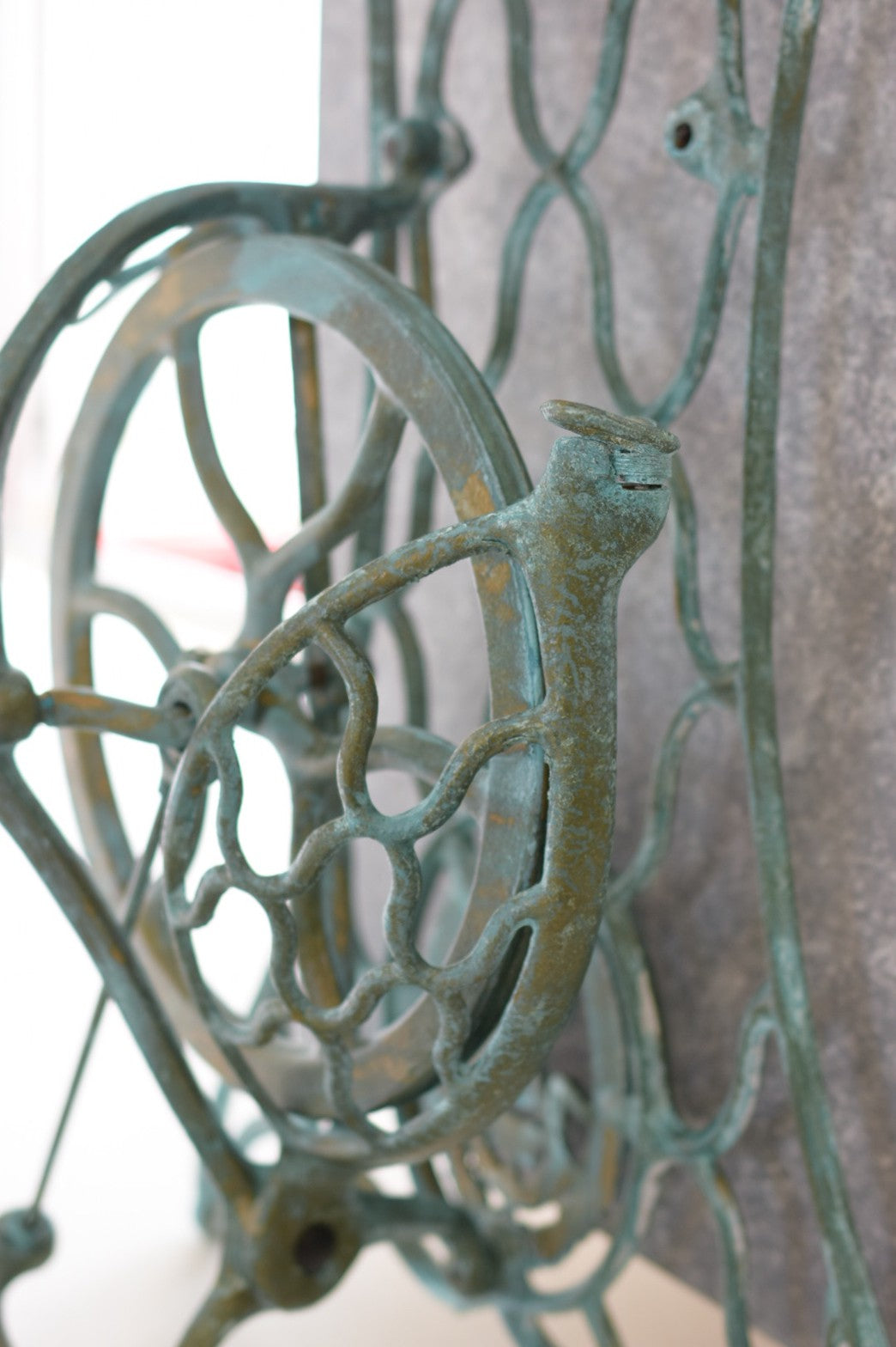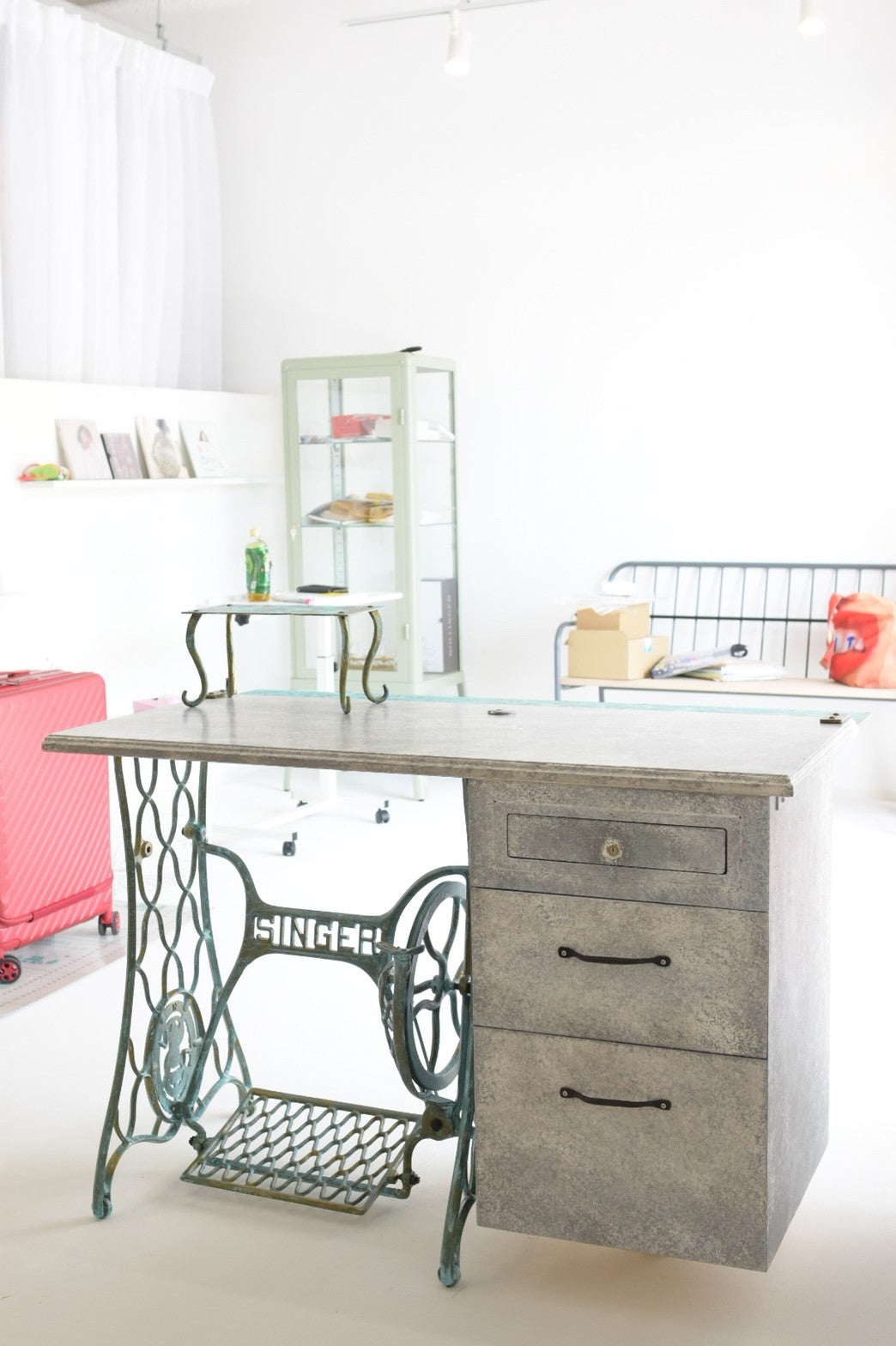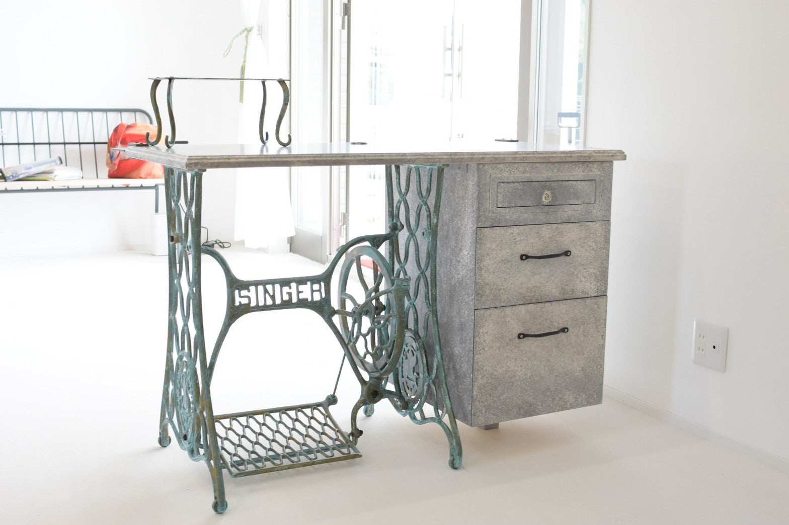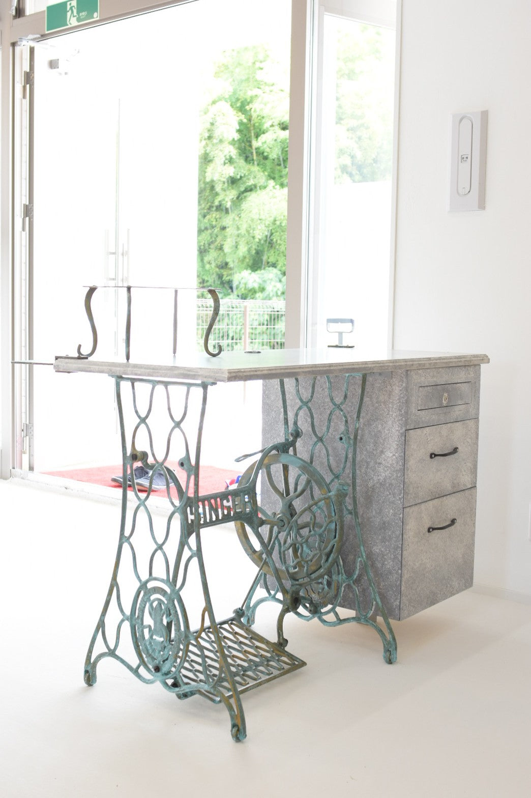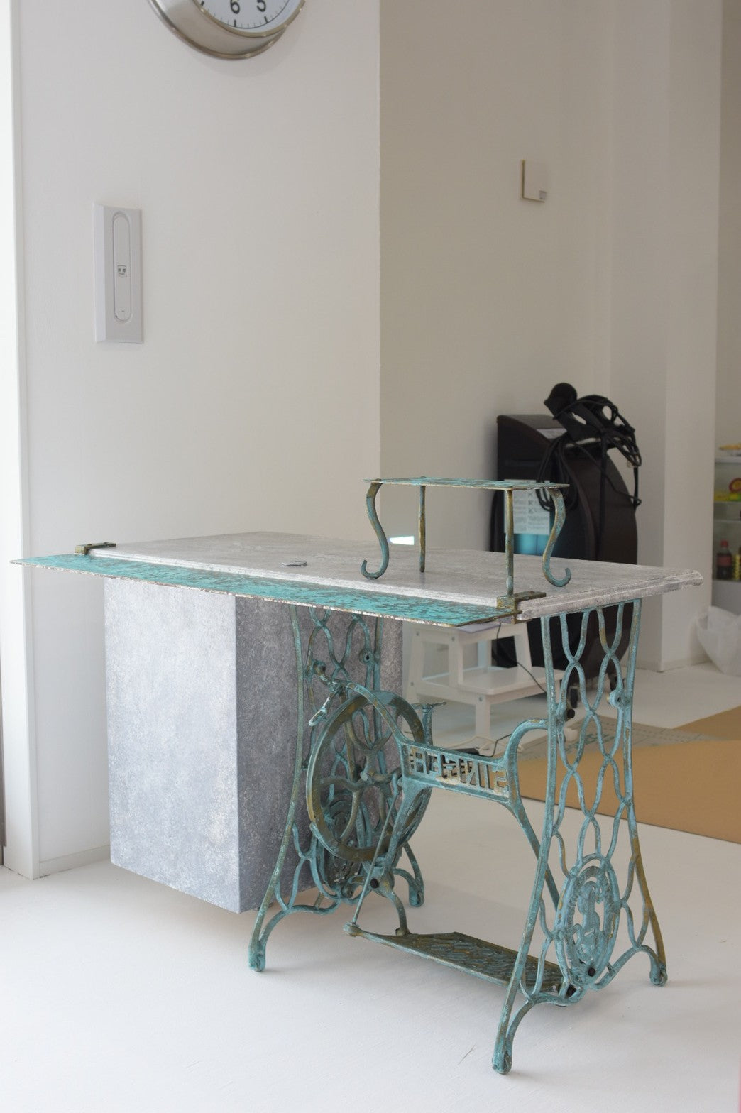 アンティークミシンの脚を用いて、それを緑青塗装に仕上げています。