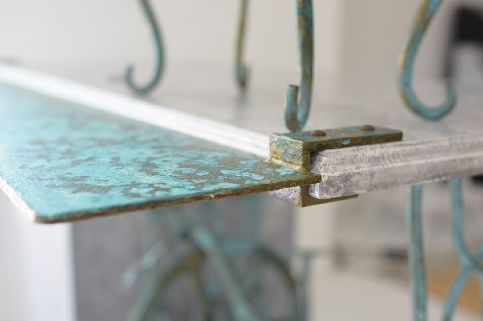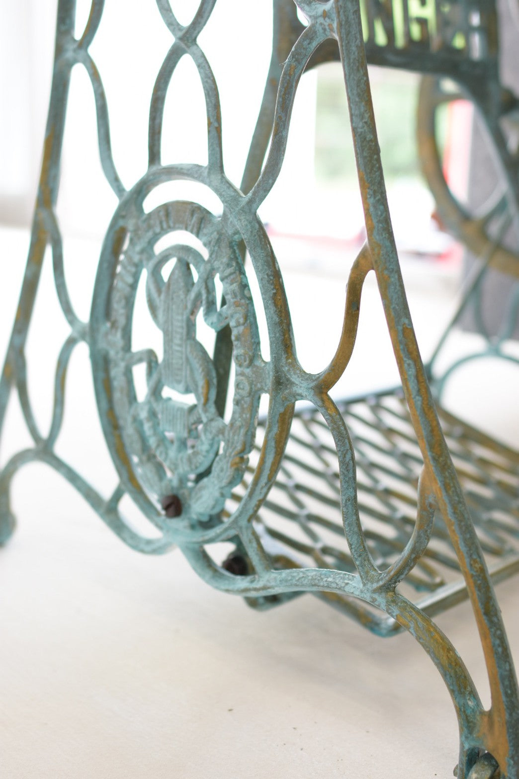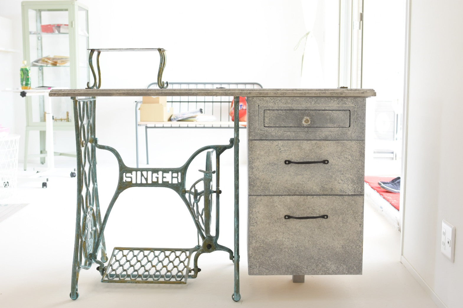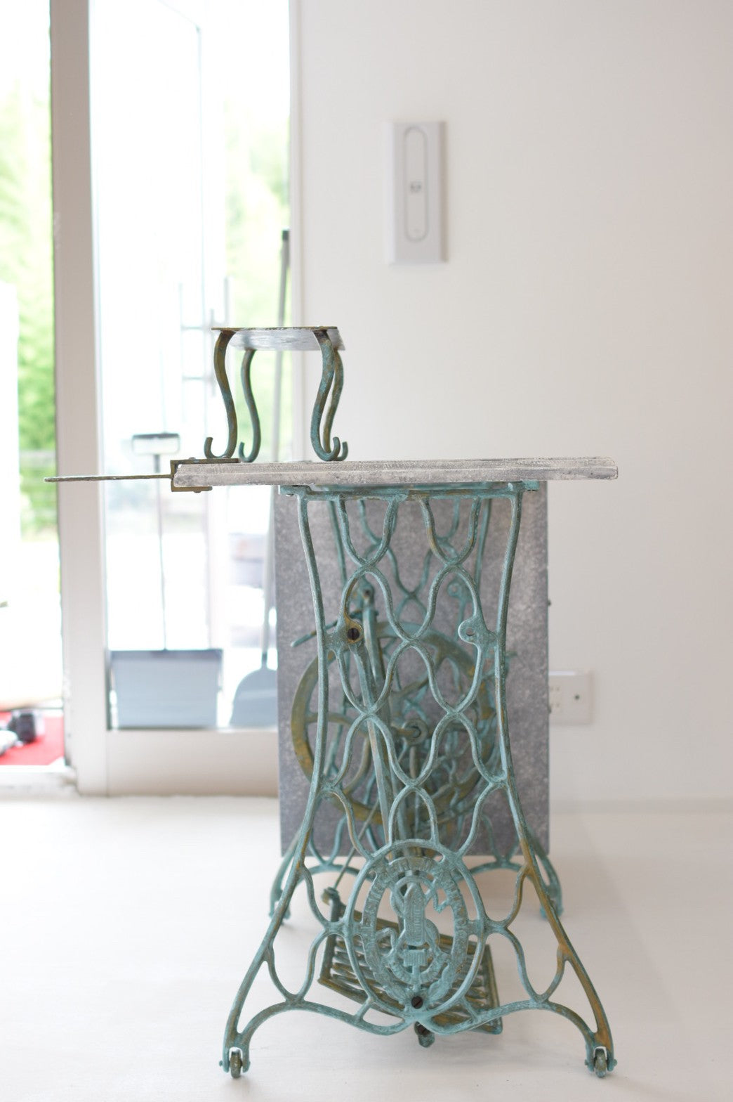 アンティークミシンの脚を用いて、それを緑青塗装に仕上げています。