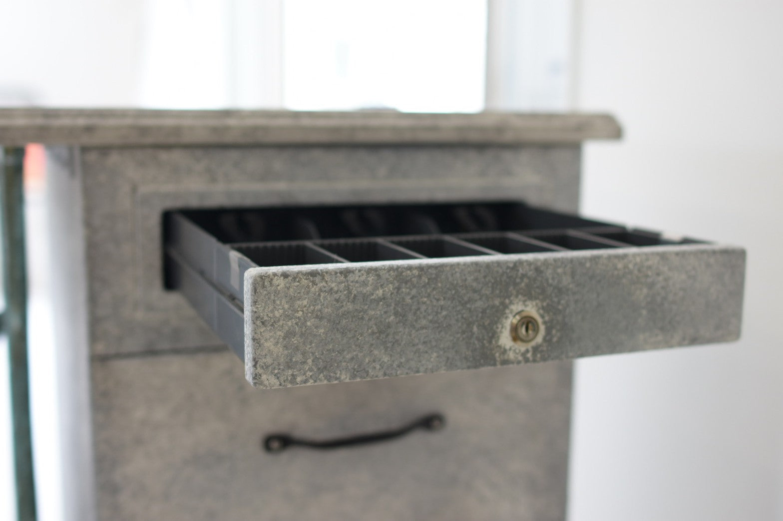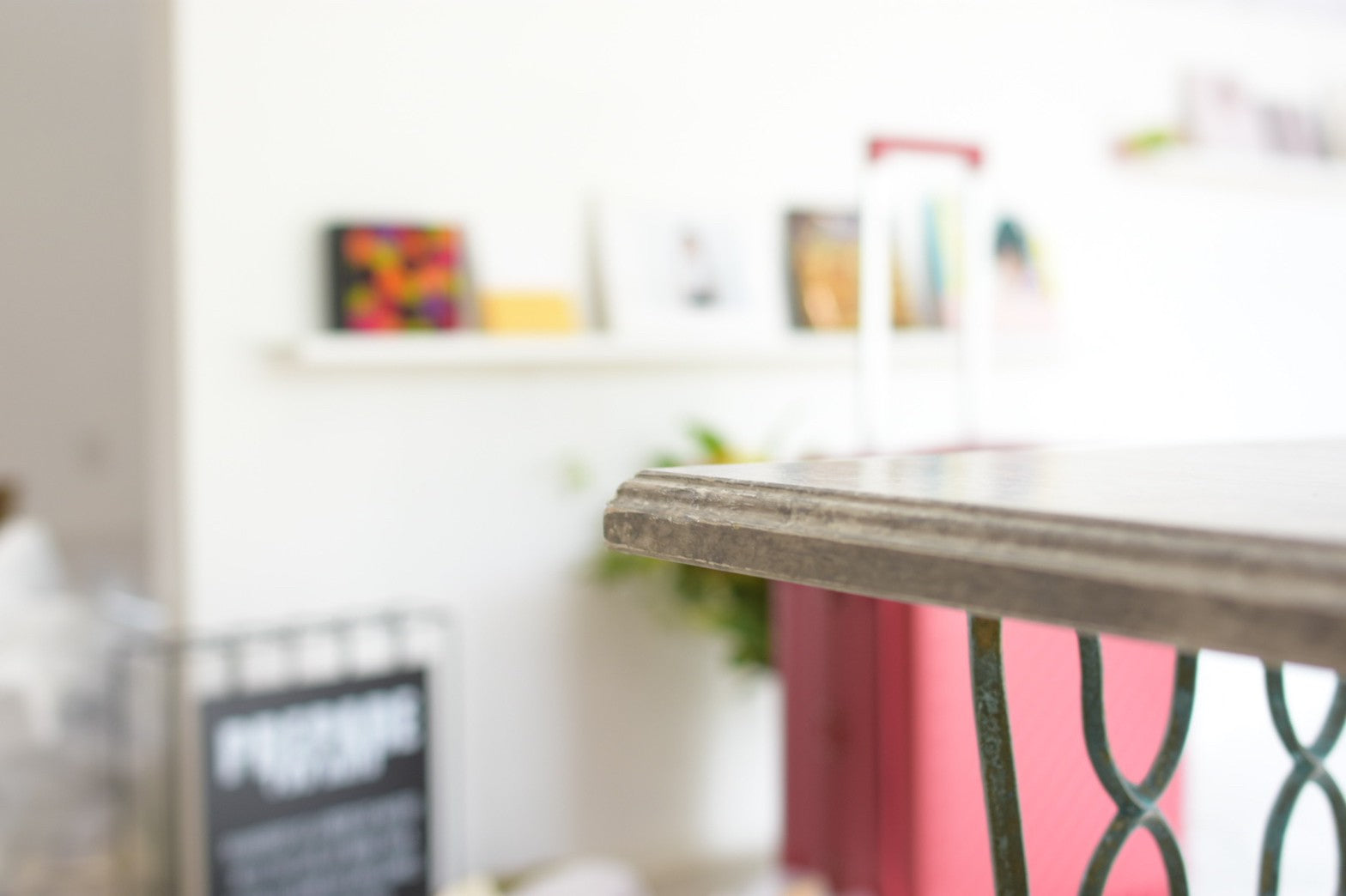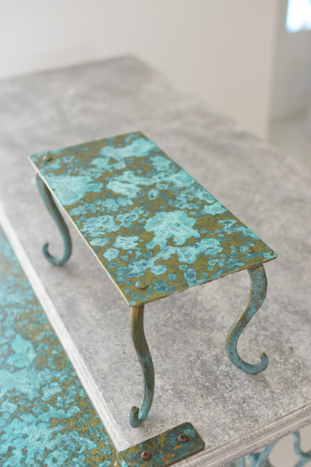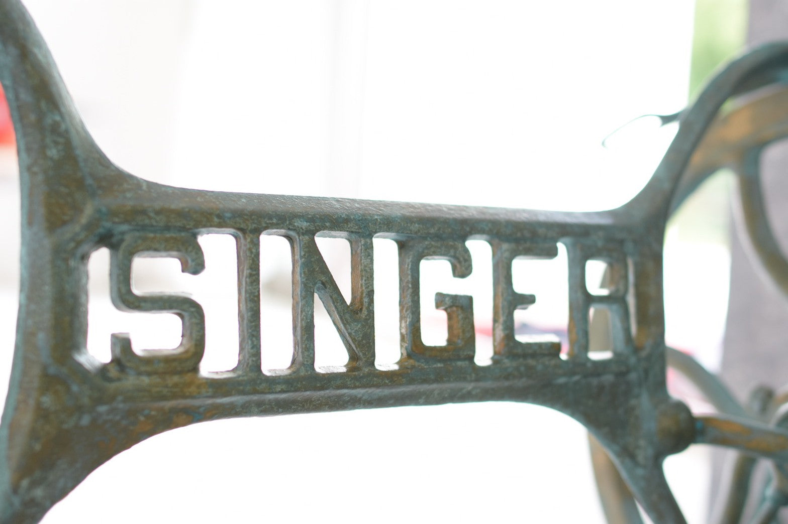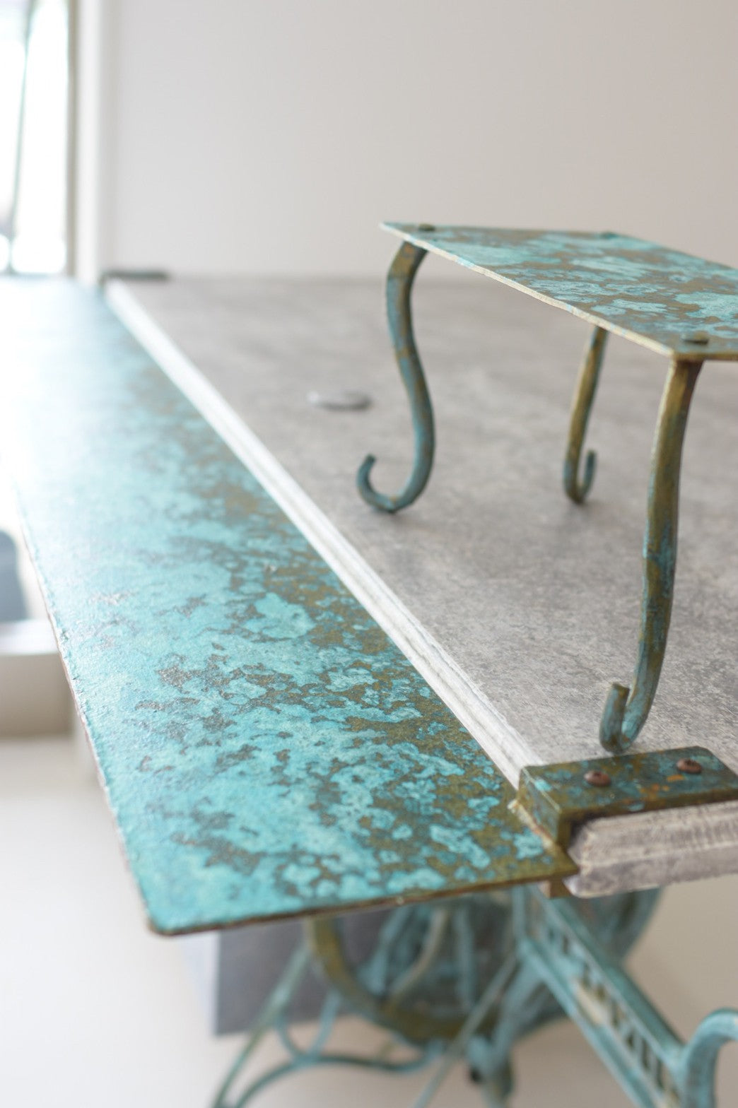アンティークミシンの脚を用いて、それを緑青塗装に仕上げています。