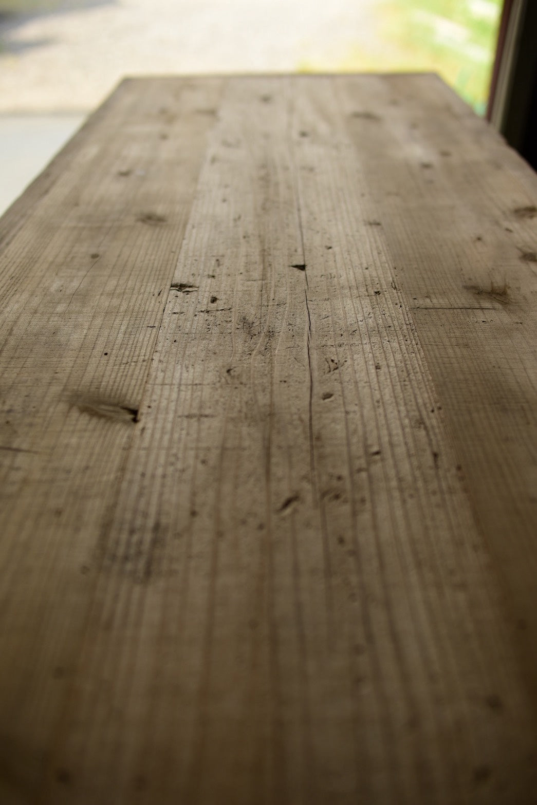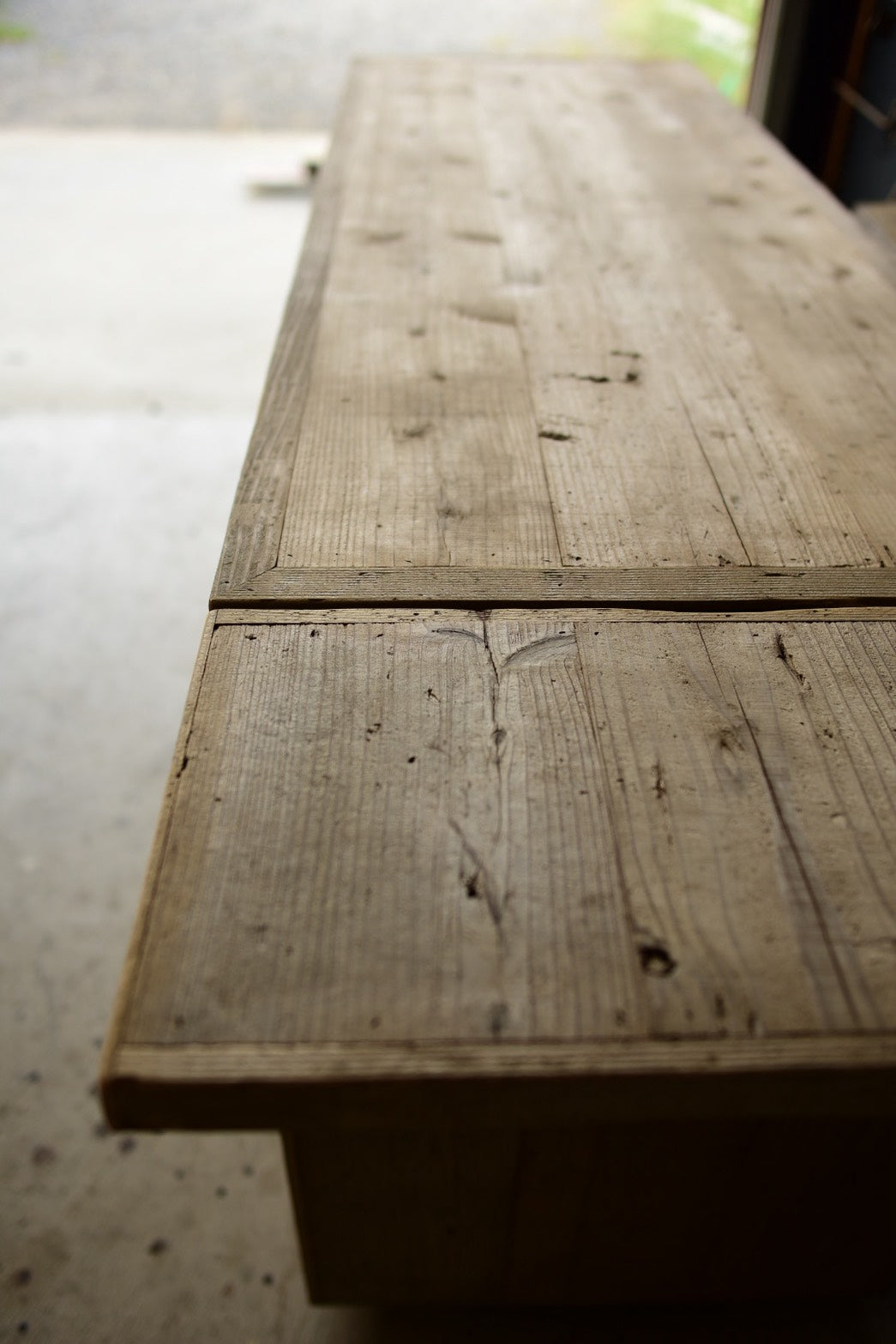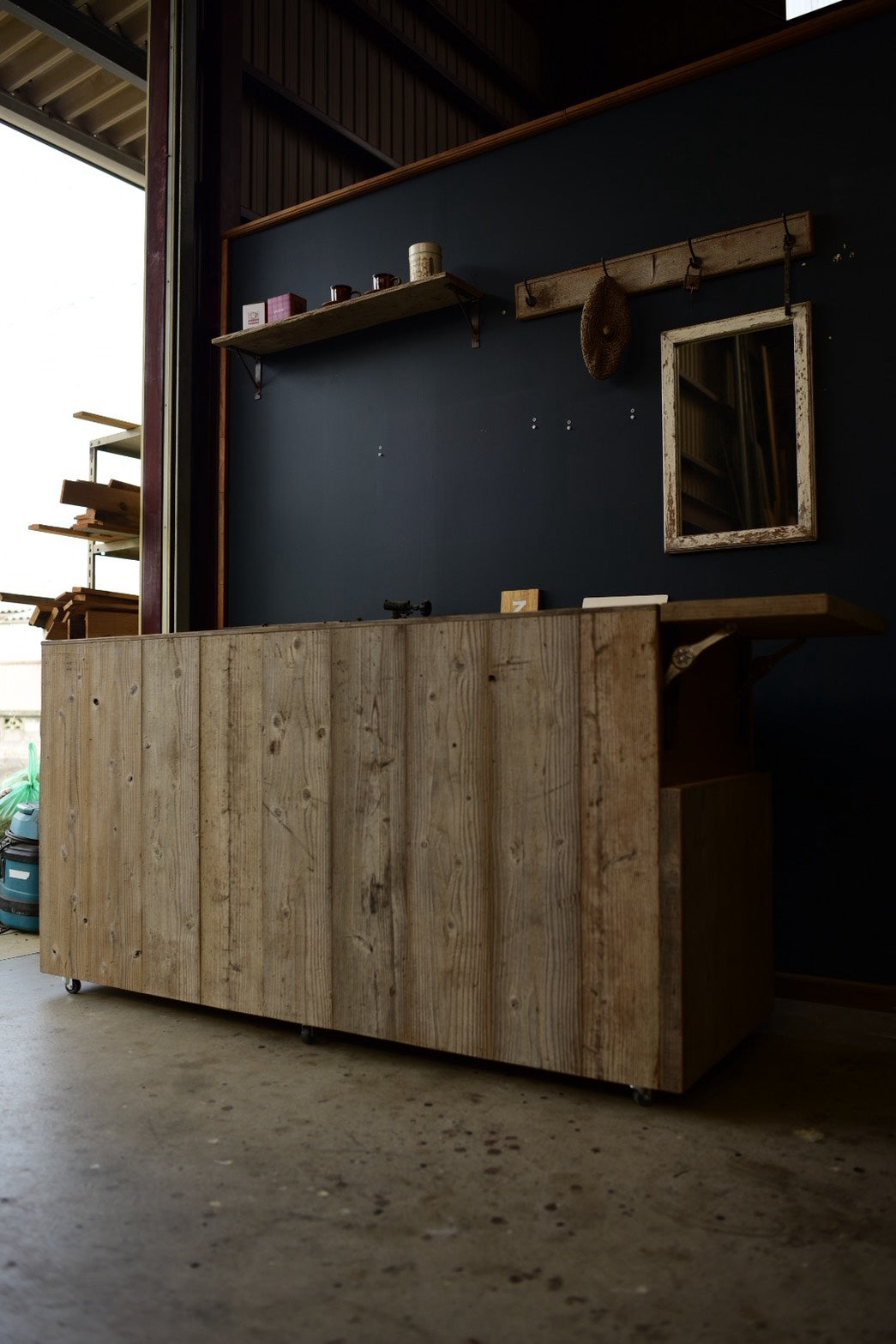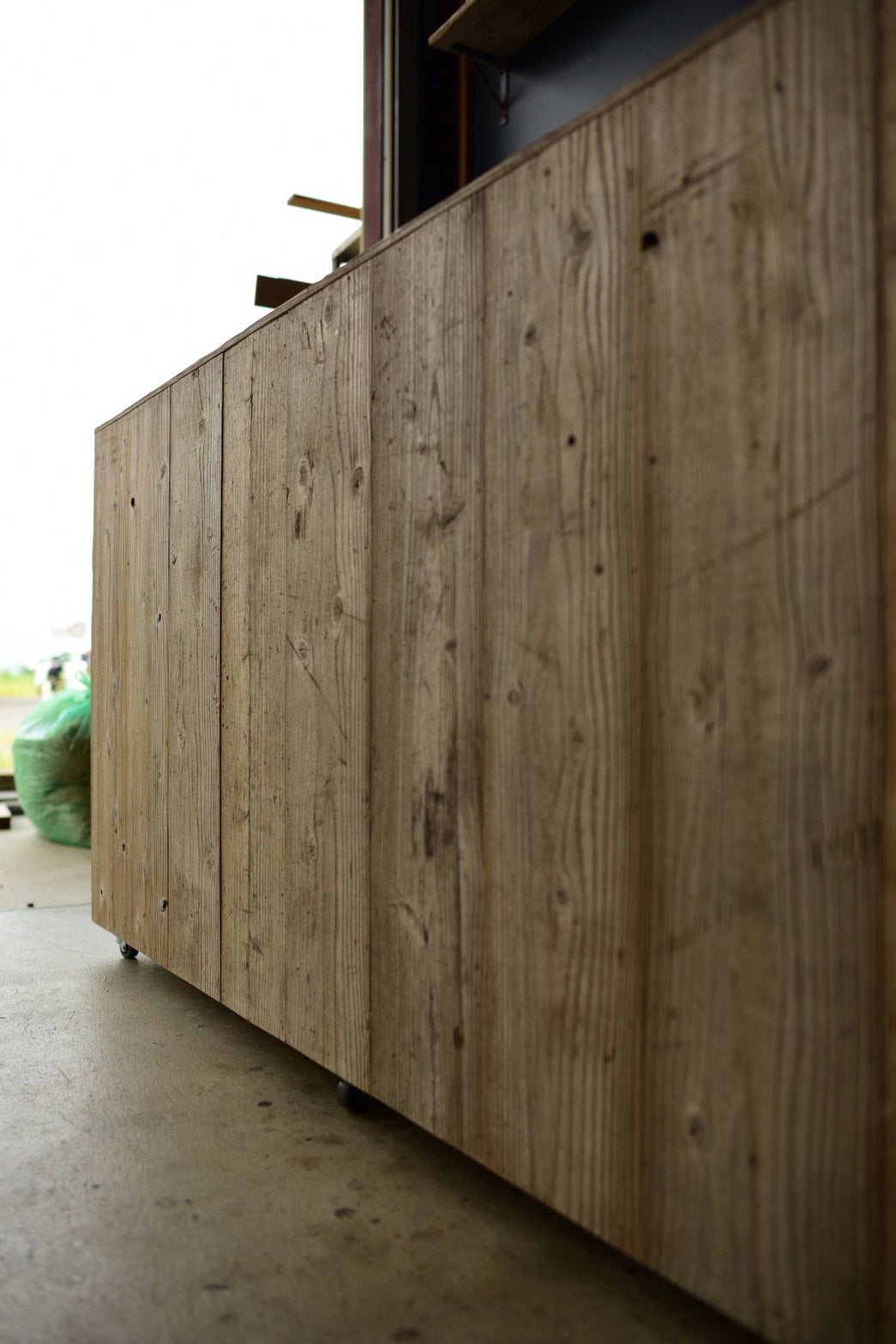 現場で実際に使われていた足場古材なので、釘跡や擦り傷、たたき傷などなど、無数の現場をくぐり抜けてきた「仕事の跡」と雨風と光を浴び続けてきたことによる地層のような隆起した木肌は、木の生きざまで尊敬の念にかられるものがあります。