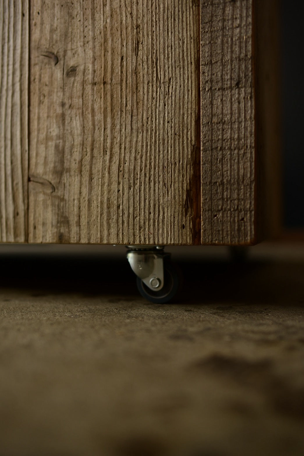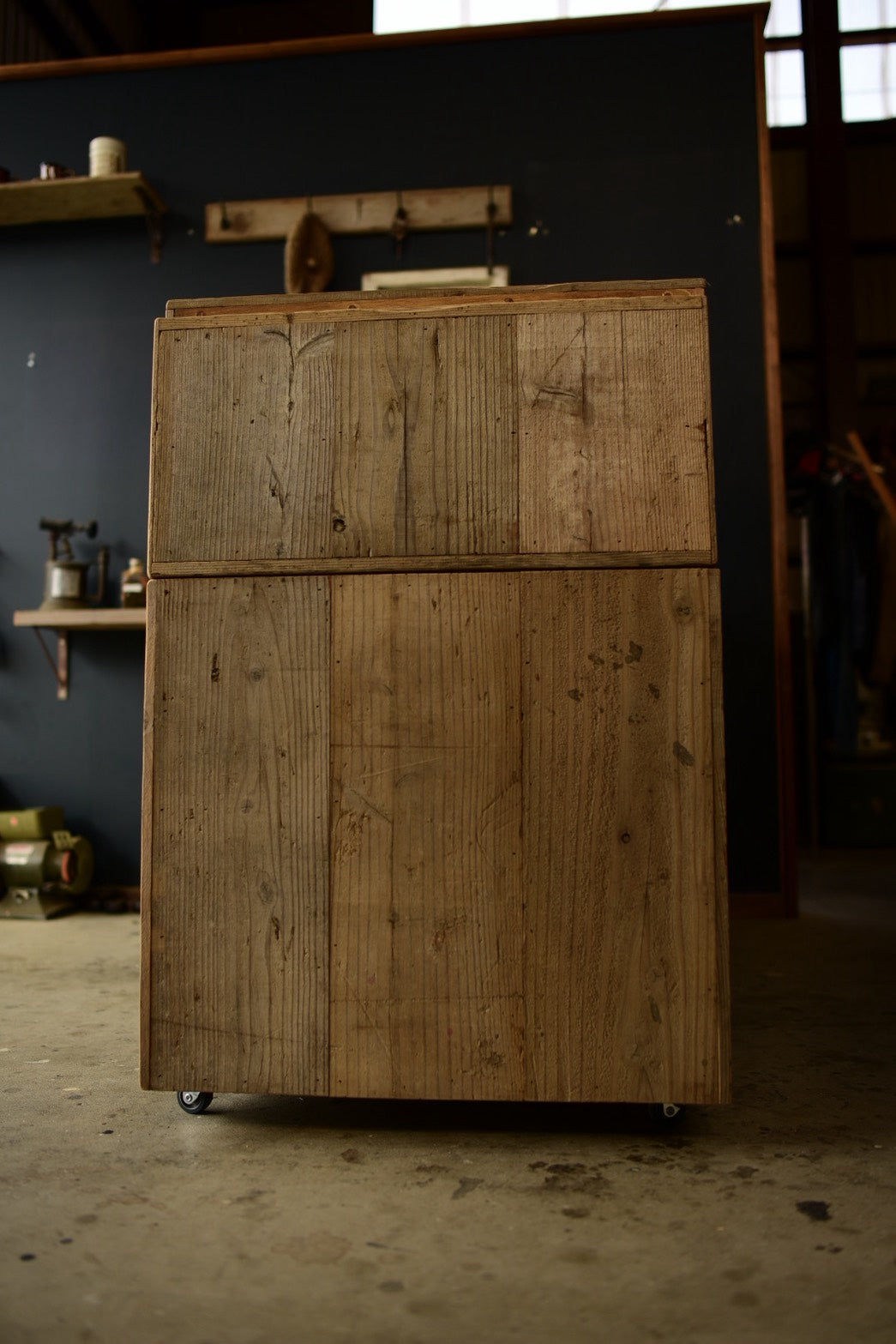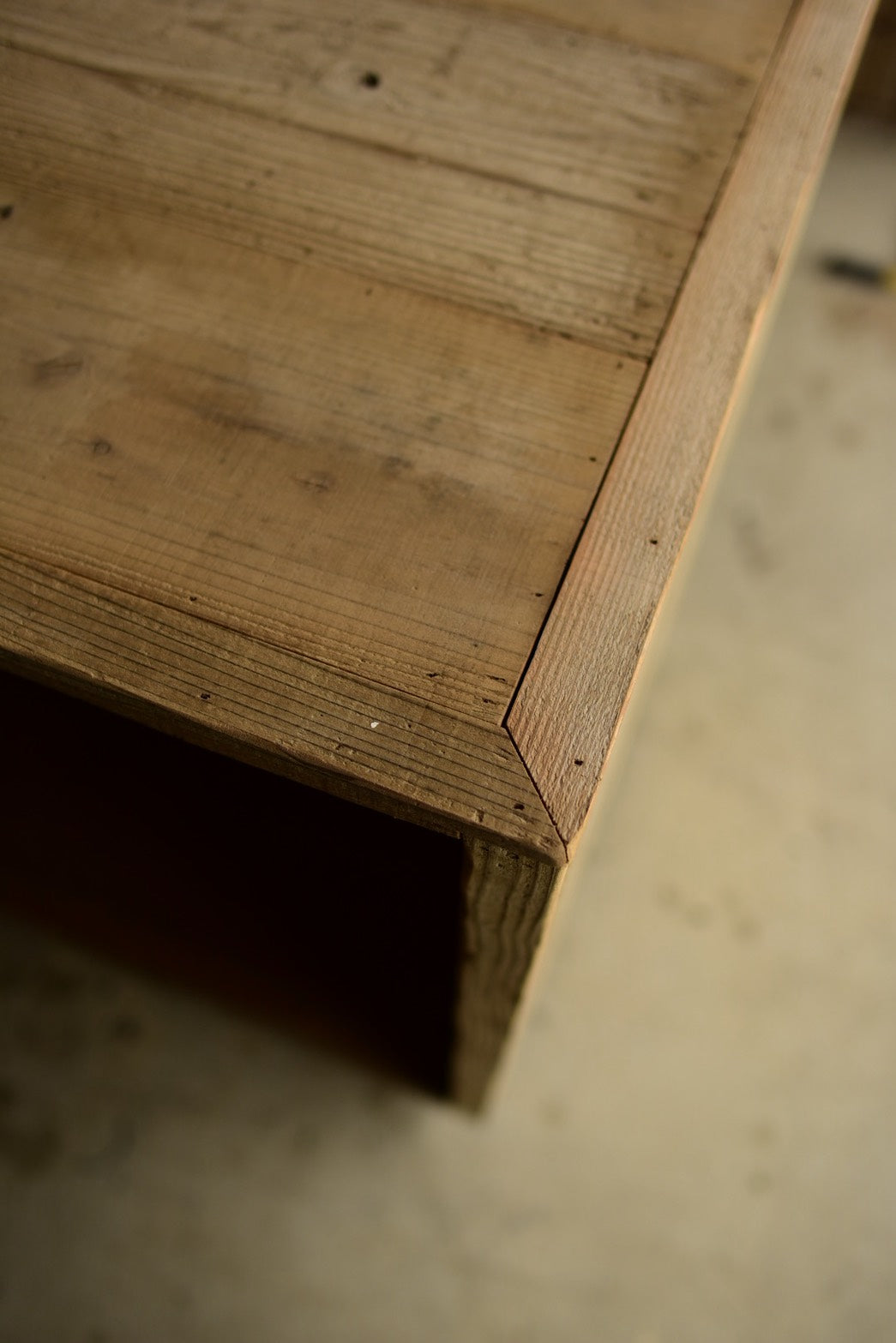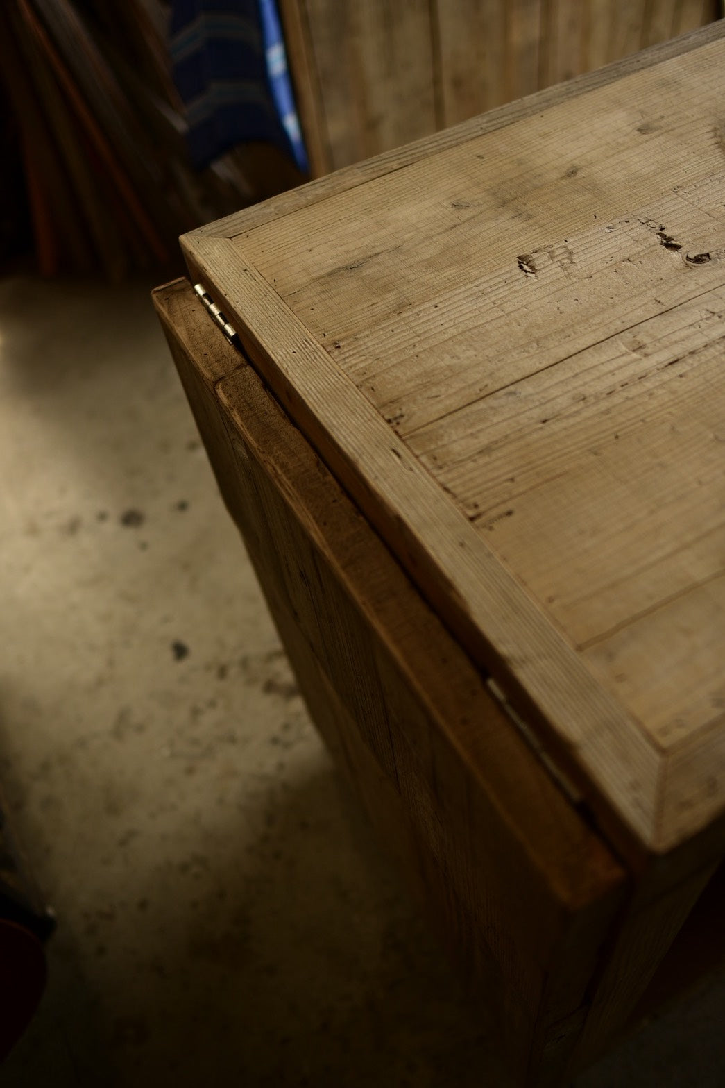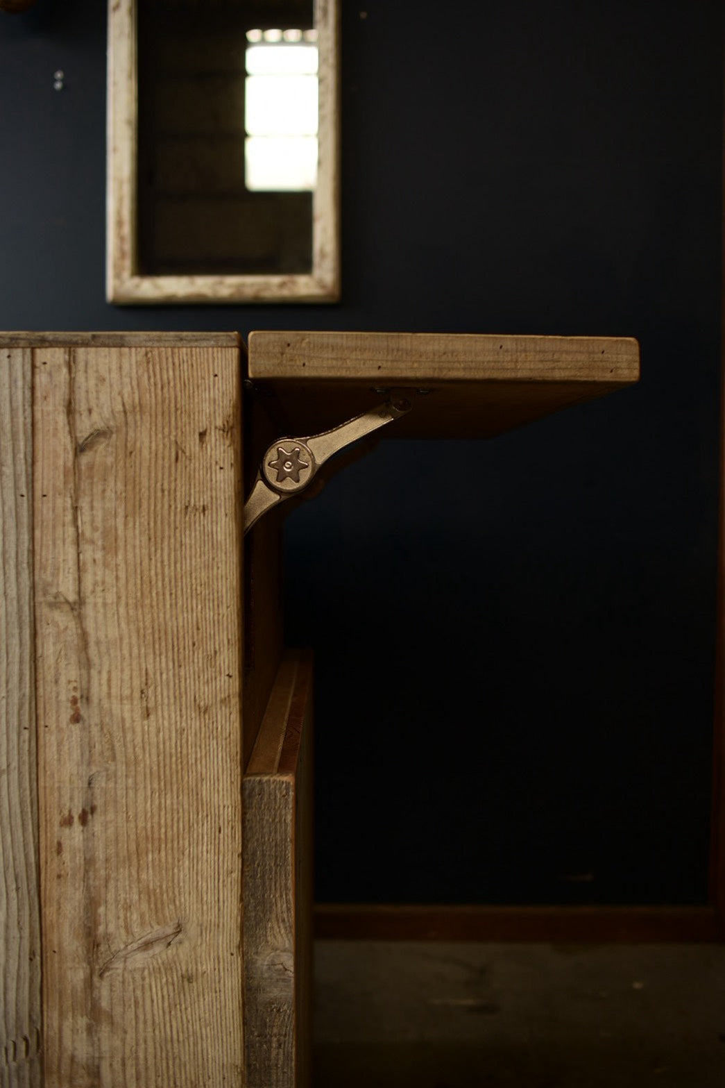 現場で実際に使われていた足場古材なので、釘跡や擦り傷、たたき傷などなど、無数の現場をくぐり抜けてきた「仕事の跡」と雨風と光を浴び続けてきたことによる地層のような隆起した木肌は、木の生きざまで尊敬の念にかられるものがあります。
