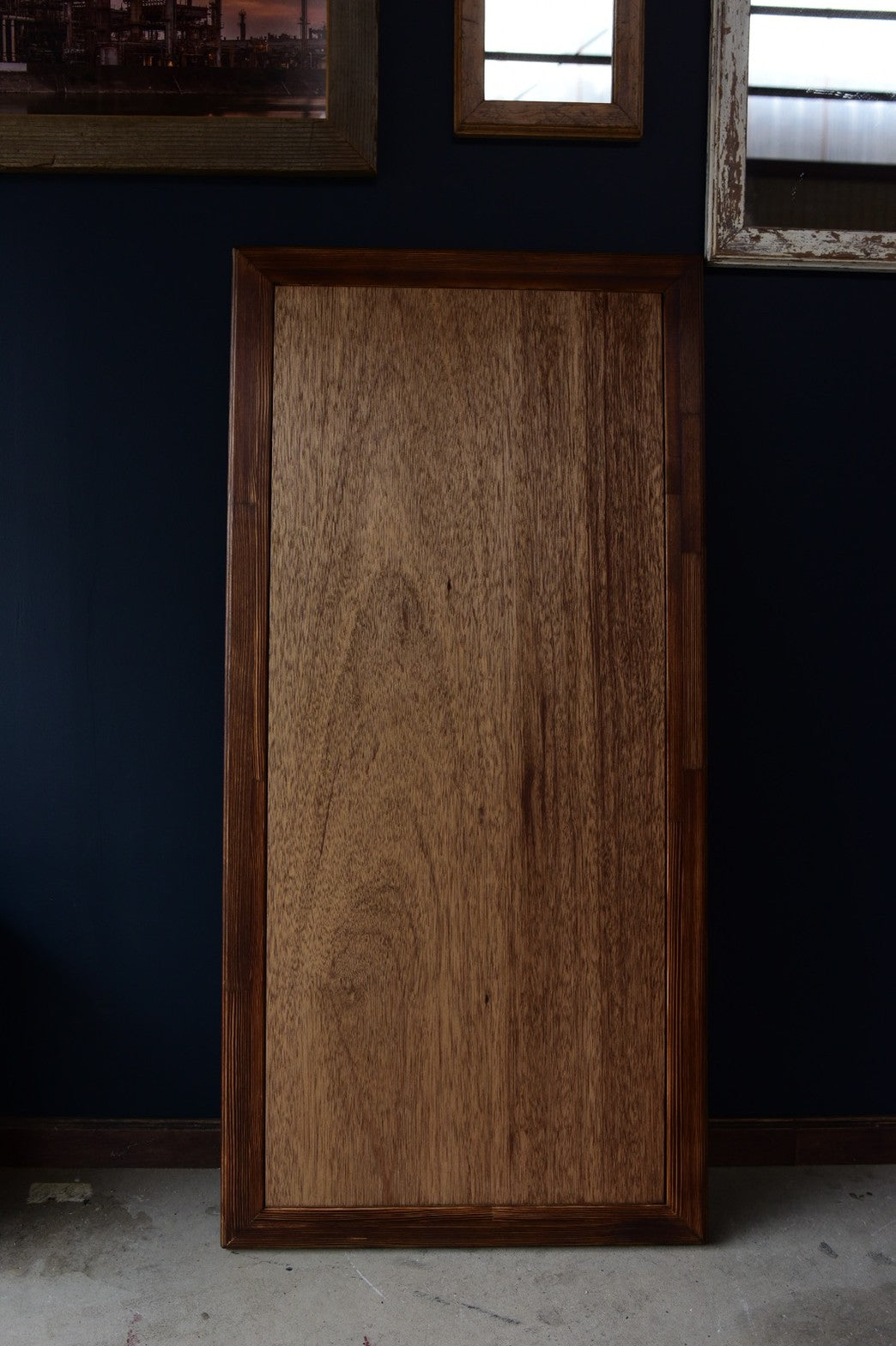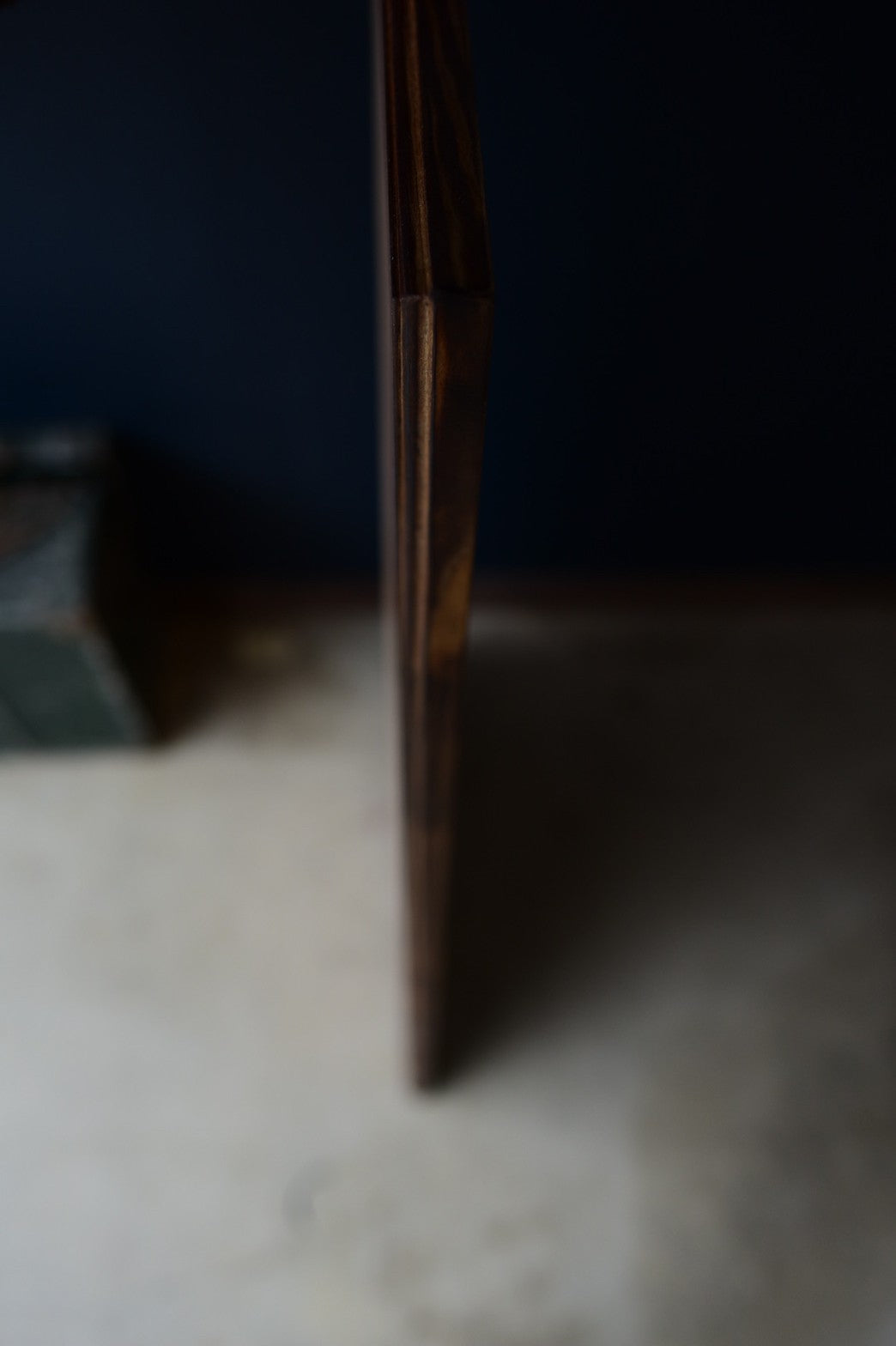 ラワンの木目の良いところを木取りし、四方枠は別で製作し、装飾トリミングをして、バーナー炙りで渋く焼き目をつけてから塗装しています。手間は掛かりますが、その一手間を掛けることで渋くカッコの良い天板となります。